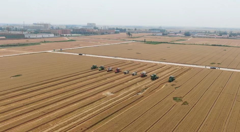 夏收時(shí)節(jié),在山東省德州市臨邑縣德平鎮(zhèn)大西關(guān)村的麥田里,幾臺收割機(jī)排成一排,轟隆隆地穿梭在金色的麥浪中。富民家庭農(nóng)場負(fù)責(zé)人魏德東指著剛收獲的小麥說:“畝產(chǎn)量將近1300斤,一畝地比往年增產(chǎn)了百十斤,不僅產(chǎn)量高,品質(zhì)也好。”