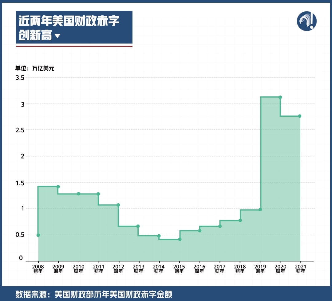 不僅如此,美國還多次出臺大規(guī)模經(jīng)濟紓困法案,2021年財政赤字率達到了12.4%,甚至已經(jīng)高于2009年金融危機期間9.8%的歷史最高水平。