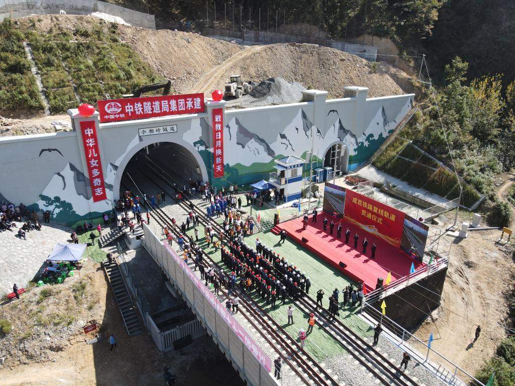 小相嶺隧道口的成昆鐵路復線軌道貫通儀式現(xiàn)場。(中國鐵路成都局集團公司供圖)