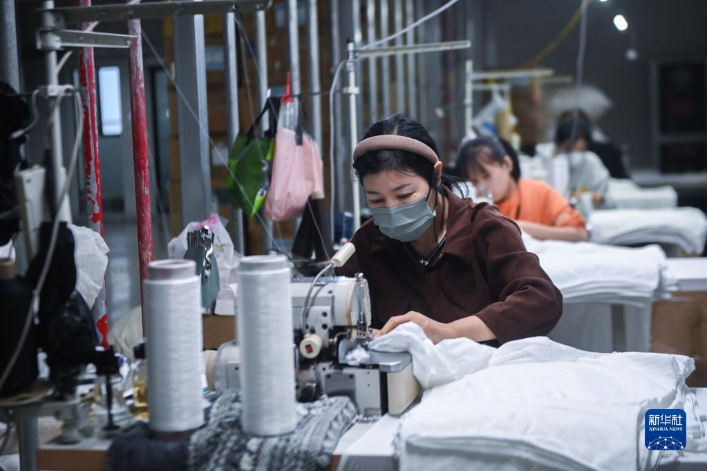 10月27日,在浙江省諸暨市大唐街道的一家專(zhuān)業(yè)生產(chǎn)拉絨打底褲產(chǎn)品的企業(yè)車(chē)間內(nèi),工作人員在加工拉絨打底褲。新華社記者 徐昱 攝