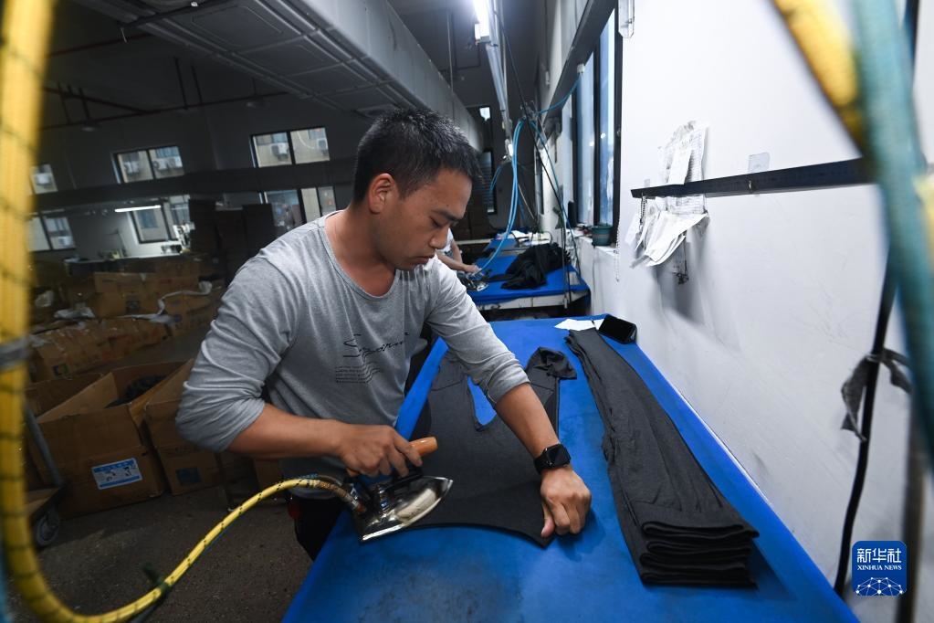 10月27日,在浙江省諸暨市大唐街道的一家企業(yè)車(chē)間內(nèi),工人在熨燙保暖褲襪。新華社記者 徐昱 攝