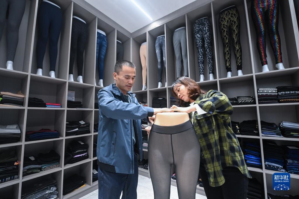 10月27日,在浙江省諸暨市大唐街道的一家專(zhuān)業(yè)生產(chǎn)拉絨打底褲產(chǎn)品的企業(yè)展廳內(nèi),工作人員給展示道具套上一款拉絨打底褲。新華社記者 徐昱 攝
