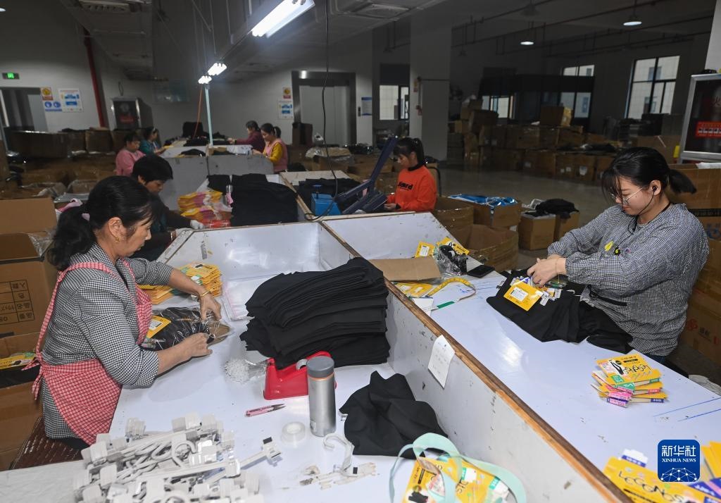 10月27日,在浙江省諸暨市大唐街道的一家企業(yè)車(chē)間內(nèi),工人在包裝保暖褲襪。新華社記者 徐昱 攝