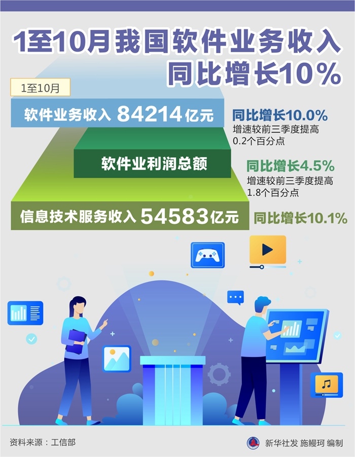 記者24日從工信部獲悉,1至10月,我國軟件和信息技術(shù)服務(wù)業(yè)運行態(tài)勢平穩(wěn)向好,軟件業(yè)務(wù)收入84214億元,同比增長10.0%,增速較前三季度提高0.2個百分點。