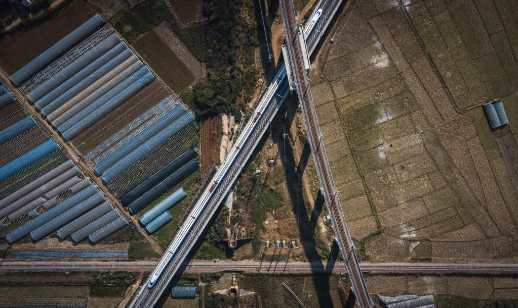 12月16日,列車行駛在與玉河鐵路(上)、滇越鐵路(底層)相互交叉的彌蒙高鐵線(中)(無人機照片)。新華社記者 王冠森 攝
