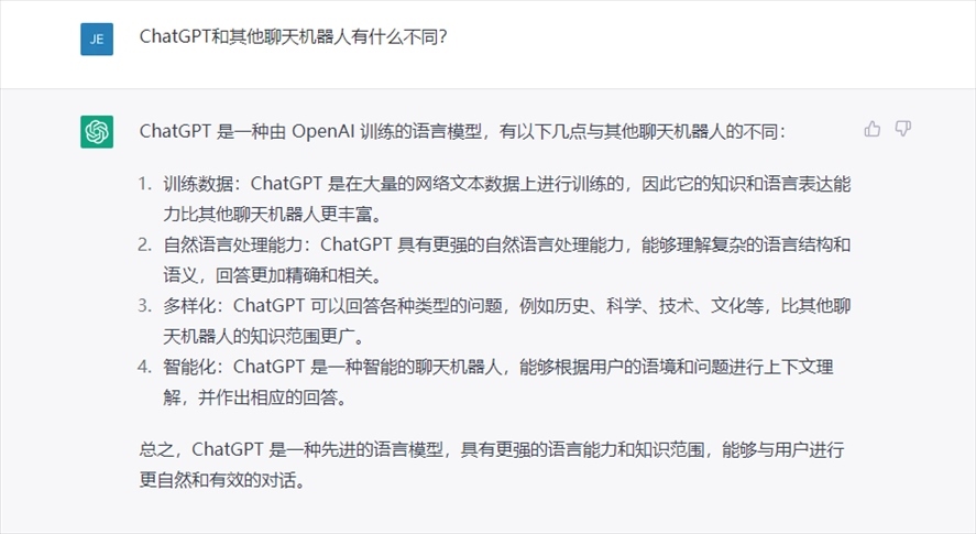 問:“ChatGPT和其他聊天機器人有什么不同?”
