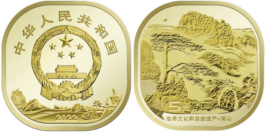 世界文化和自然遺產(chǎn)——黃山普通紀念幣正面圖案為中華人民共和國國徽,國徽上方刊“中華人民共和國”國名,下方為裝飾風格的黃山圖案并刊年號“2022”字樣;背面主景圖案為迎客松和黃山山峰等,主景圖案下方刊“世界文化和自然遺產(chǎn)——黃山”字樣和面額“5元”字樣。