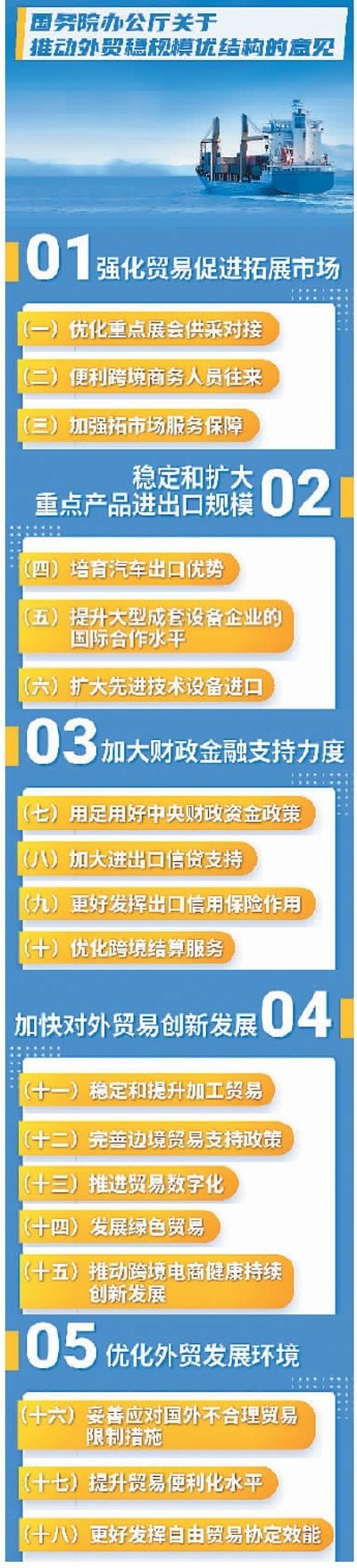 為推動外貿穩(wěn)規(guī)模優(yōu)結構,在前期已出臺多輪政策舉措的基礎上,國務院辦公廳4月25日對外發(fā)布《關于推動外貿穩(wěn)規(guī)模優(yōu)結構的意見》(以下簡稱《意見》),推出新一輪措施。專家認為,此次提出的18條具體措施既涉及重點產品,也關乎市場拓展和貿易創(chuàng)新,具有很強的針對性和操作性,有助于穩(wěn)住外貿規(guī)模,并在此基礎上進一步優(yōu)化外貿結構,推動實現(xiàn)全年進出口促穩(wěn)提質目標任務。
