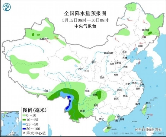 5月15日08時(shí)至16日08時(shí),云南中西部、西藏東南部、川西高原南部、重慶南部、貴州北部等地的部分地區(qū)有中到大雨,其中,西藏東南部、云南西部等地部分地區(qū)有暴雨(50~60毫米)。內(nèi)蒙古、東北地區(qū)、新疆北部等地的部分地區(qū)有4~6級(jí)風(fēng),其中,新疆東部部分地區(qū)有6~7級(jí)風(fēng),東部山口局地陣風(fēng)風(fēng)力可達(dá)10級(jí)左右。