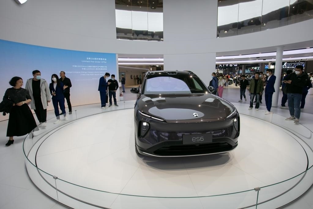 4月25日,人們?cè)谏虾\囌股蠀⒂^正式首發(fā)亮相的蔚來(lái)全新ES6。新華社記者王翔攝