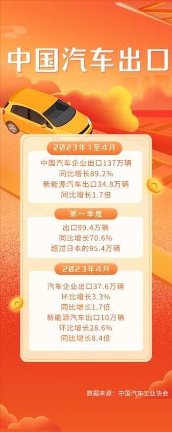中國(guó)汽車工業(yè)協(xié)會(huì)的統(tǒng)計(jì)數(shù)據(jù)顯示,今年第一季度,國(guó)內(nèi)汽車企業(yè)出口99.4萬(wàn)輛,同比增長(zhǎng)70.6%,超過(guò)日本的95.4萬(wàn)輛。最新數(shù)據(jù)顯示,4月份,出口37.6萬(wàn)輛,同比增長(zhǎng)1.7倍,其中,電動(dòng)、混動(dòng)等新能源汽車出口10萬(wàn)輛,環(huán)比增長(zhǎng)28.6%,同比增長(zhǎng)8.4倍,保持良好勢(shì)頭。