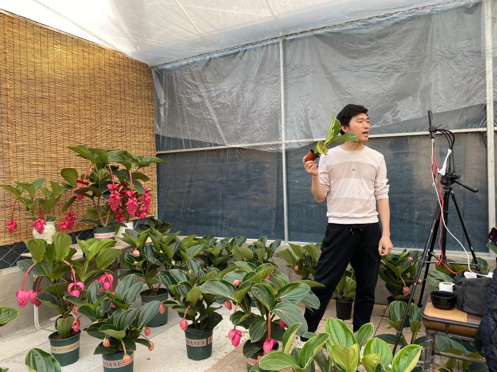 李莎莎的花卉大棚內(nèi),主播正在直播銷售寶蓮燈花。新華社記者 陳國峰 攝