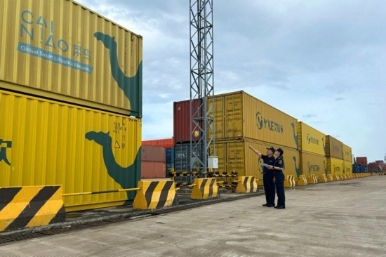 周華偉和搭檔一起對出口貨物進行查驗。受訪者供圖