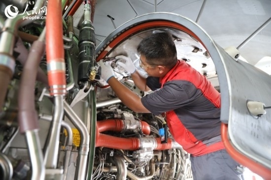 技術(shù)人員對飛機進(jìn)行維修。 人民網(wǎng)記者 孟凡盛攝