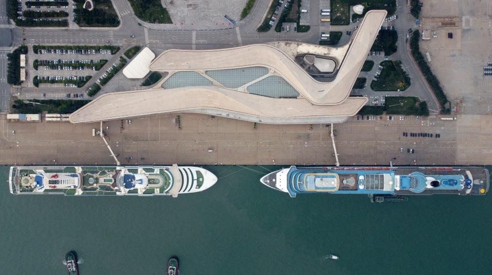 9月27日,“夢(mèng)想”號(hào)郵輪(左)、“地中?!碧?hào)郵輪靠泊在天津國(guó)際郵輪母港準(zhǔn)備啟航(無(wú)人機(jī)照片)。新華社記者 趙子碩 攝