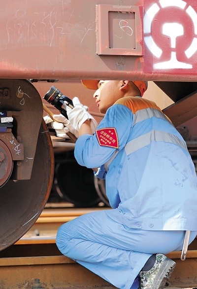 在鄭州北站,一名工人正對(duì)車底進(jìn)行檢修。本報(bào)記者 何嘉豪攝