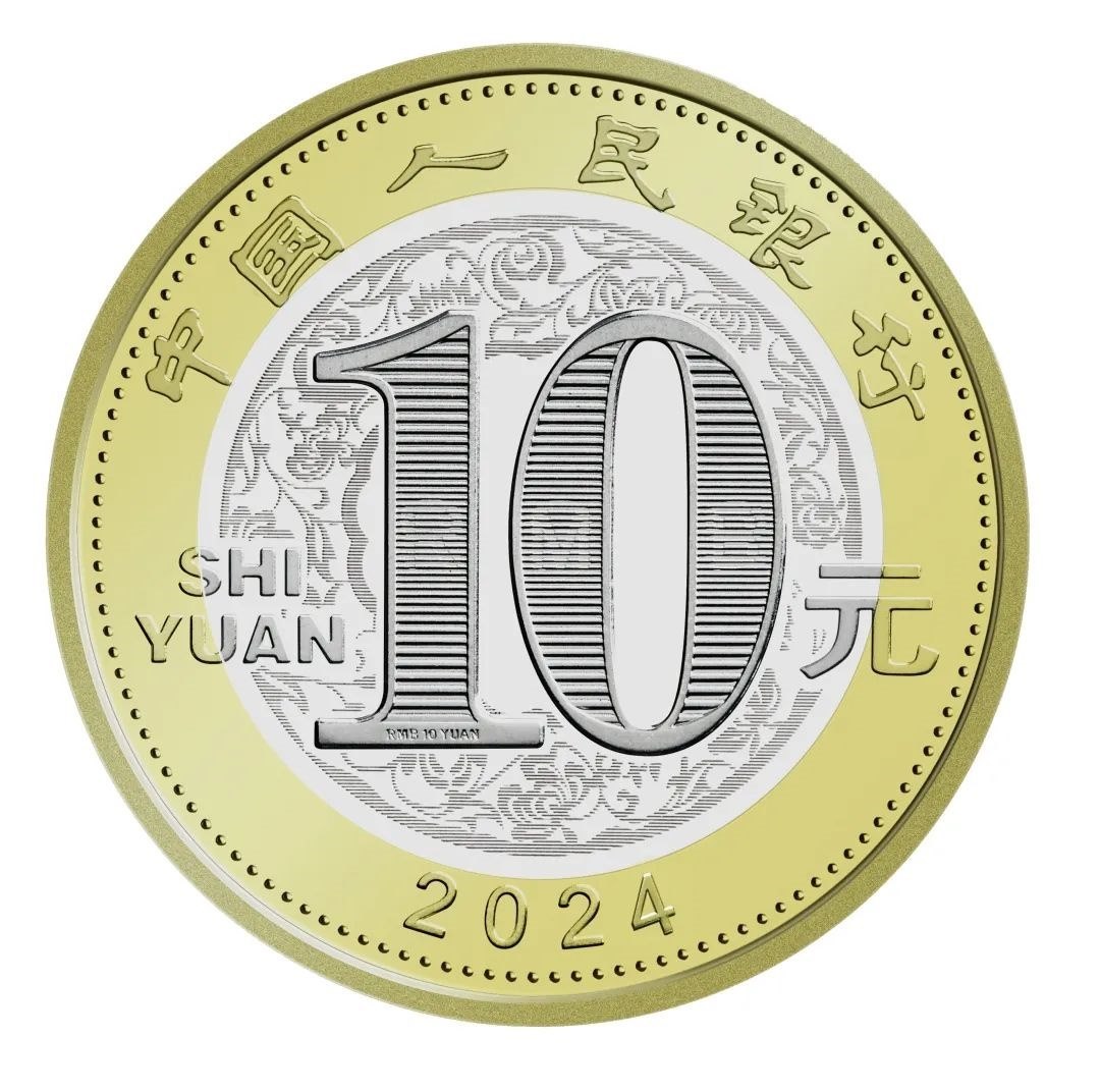 雙色銅合金紀(jì)念幣正面圖案為“中國(guó)人民銀行”、“10元”字樣,漢語拼音字母“SHIYUAN”及年號(hào)“2024”,底紋襯以團(tuán)花圖案。