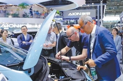 外國(guó)觀眾在北京車(chē)展廣汽埃安展臺(tái)參觀。王子牧攝
