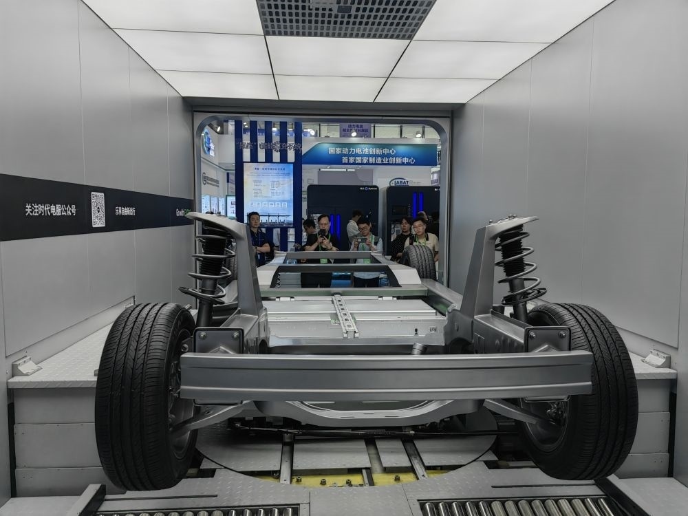 這是在四川省宜賓市舉行的2023世界動(dòng)力電池大會上展示的新能源汽車換電系統(tǒng)(2023年6月9日攝)。新華社記者 胡旭 攝