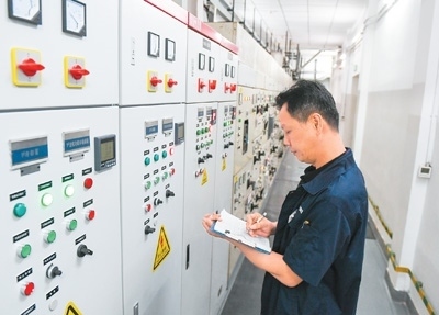 8月21日,在廣東省深圳市國貿大廈空調機房,物業(yè)工作人員在新裝的智能物聯(lián)網控制柜前進行運行抄表。新華社記者 毛思倩攝