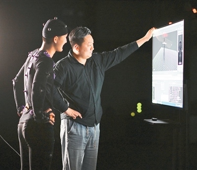 4月30日,在天津市濱海新區(qū)國家動漫園里的大型動作捕捉棚內,身著特定裝備的動捕演員(左)和同事在查看電腦生成的虛擬角色動作。新華社記者 趙子碩攝