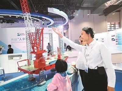 第十六屆國際交通技術(shù)與設(shè)備展覽會(huì)上,觀眾在參觀“大橋海風(fēng)”號(hào)風(fēng)電安裝船。杜建坡攝(人民圖片)
