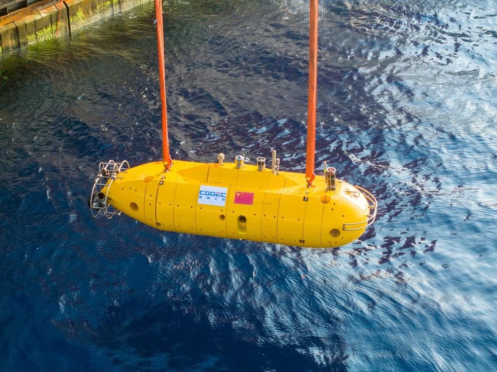 我國自主研發(fā)深水海管鋪設(shè)智能監(jiān)測裝備“海衛(wèi)”系統(tǒng)水下自主遙控機器人進行入海測試。(海油工程供圖)
