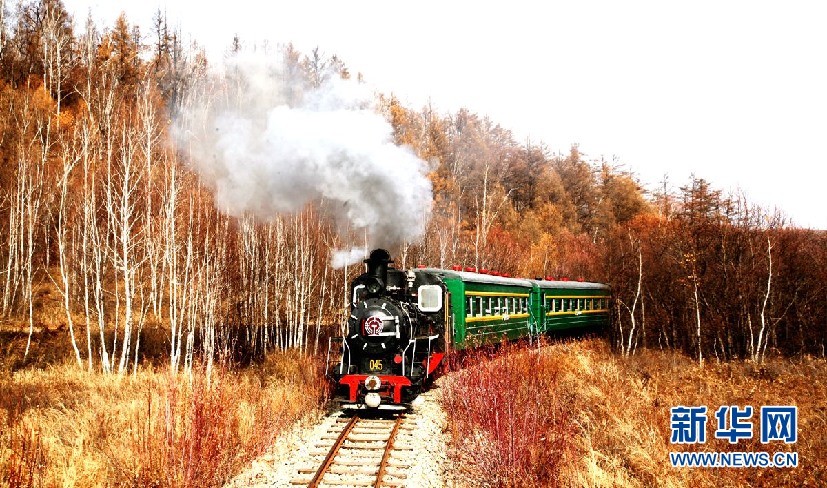 金秋時(shí)節(jié),在內(nèi)蒙古大興安嶺阿里河國(guó)家森林公園內(nèi),森林蒸汽機(jī)小火車帶領(lǐng)游客穿越秋季美景。(9月28日攝)新華網(wǎng)發(fā)(欒維敬 攝)