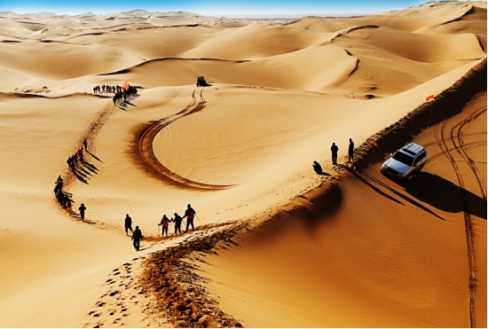4月8日,內(nèi)蒙古鄂爾多斯杭錦旗境內(nèi)的庫布其沙漠,一隊游客正在沙漠中穿沙。