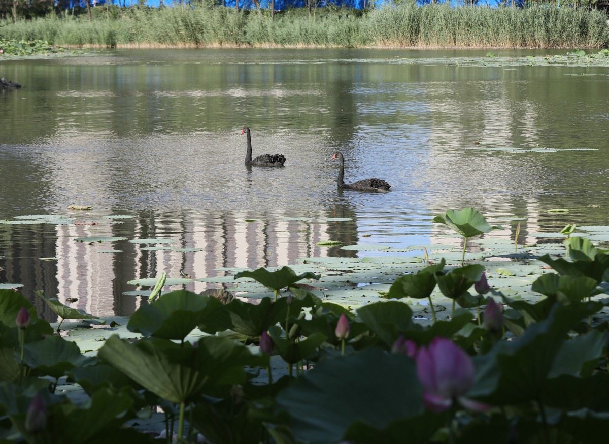 7月8日,兩只黑天鵝在青城公園荷花叢旁游過(guò)