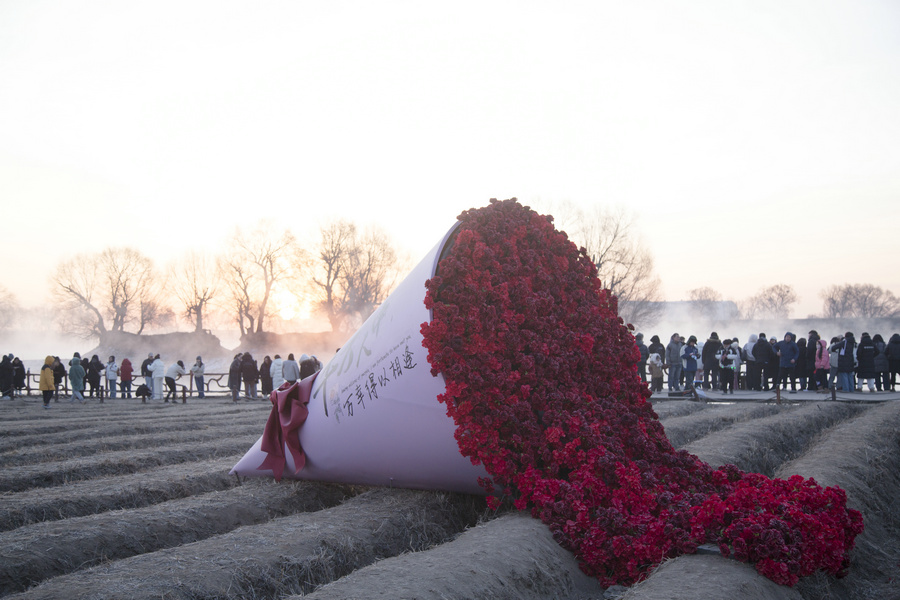 1月4日清晨,房車營(yíng)地內(nèi)的暖冬造趣節(jié)現(xiàn)場(chǎng)游客在排隊(duì)領(lǐng)取免費(fèi)奶茶
