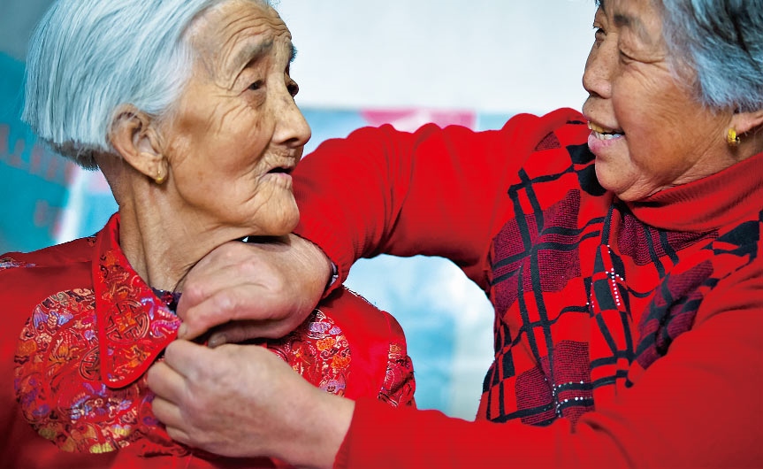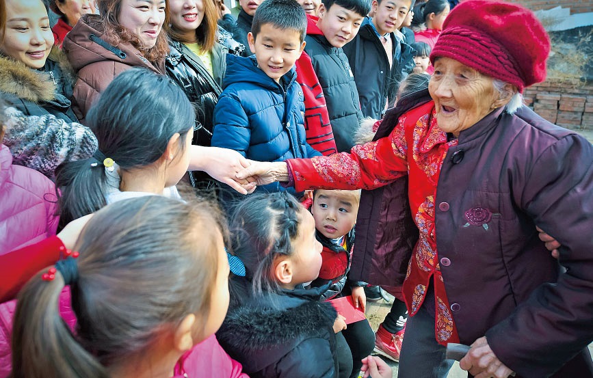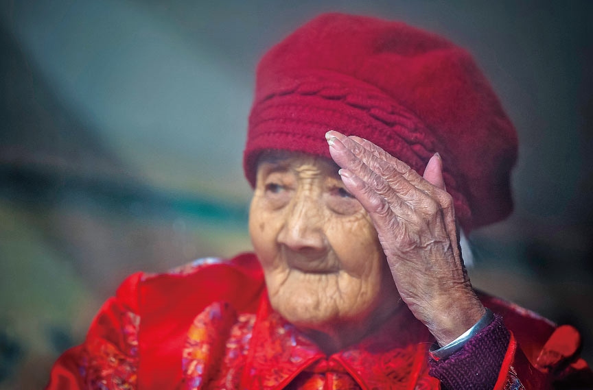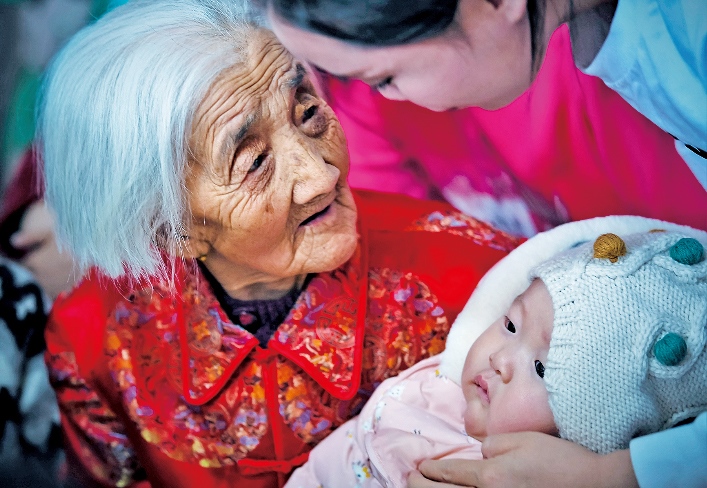 老人的兒孫們?nèi)缃翊蠖喽荚谕鈱W(xué)習(xí)、工作、做生意,大家族的成員日子都過得紅紅火火。對于老人來說,子孫滿堂是最幸福的事;對于孩子們來說,老人健康長壽,也是他們最大的愿望。五世同堂,98口人,百歲老人賈先女露出幸福的笑容。