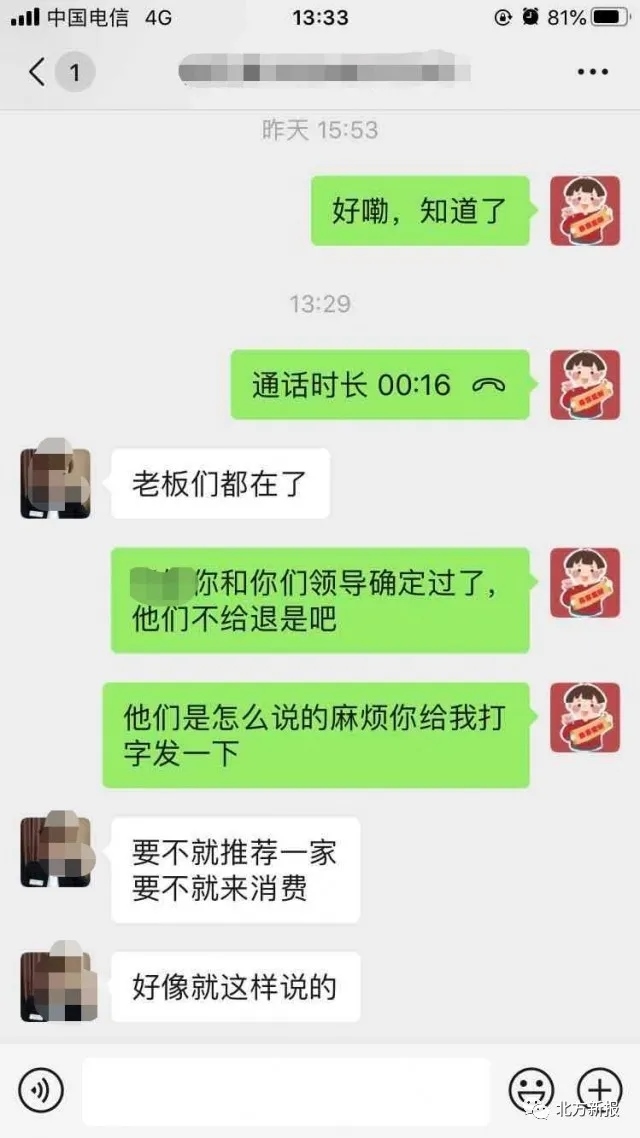 高先生提供給記者的一份微信聊天記錄顯示,當(dāng)高先生提出退還押金的要求時,白泉山莊海世盛宴的工作人員告知,要不就推薦其他人到這里舉辦婚禮,要不就來這里消費以抵消押金??傊航鹗遣荒芡说?。