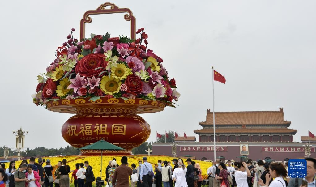 游人在天安門廣場觀賞“祝福祖國”主題花壇(9月28日攝) 新華社記者 李欣 攝