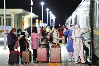 10月30日晚,又一批符合條件的滯留游客搭乘火車(chē)離開(kāi)額濟(jì)納旗轉(zhuǎn)運(yùn)至低風(fēng)險(xiǎn)地區(qū)。記者 王磊 見(jiàn)習(xí)記者 王坤 攝