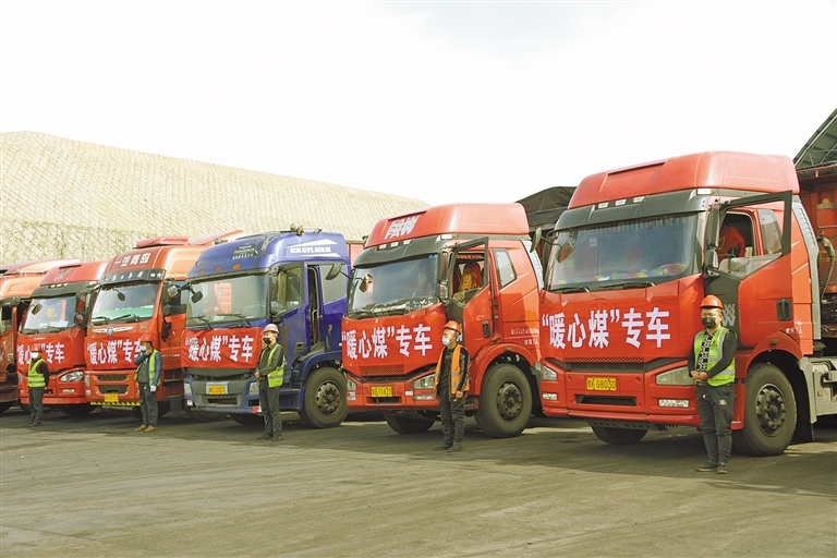 10月24日,一輛輛掛著大紅綢、載著“暖心煤”的運煤大卡車排成一列,從鄂爾多斯達拉特旗杭蓋溝煤礦整裝待發(fā),即將發(fā)往位于吉格斯太鎮(zhèn)的榮通煤炭物流園區(qū),那里是該鎮(zhèn)“暖心煤”的發(fā)放點。