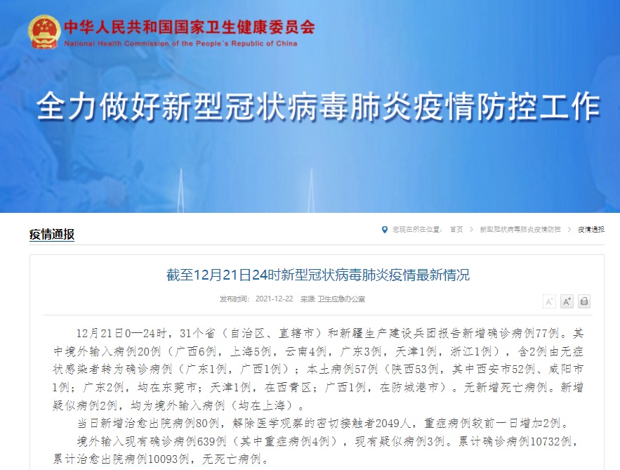 12月21日0—24時,31個省(自治區(qū)、直轄市)和新疆生產(chǎn)建設(shè)兵團報告新增確診病例77例。其中境外輸入病例20例(廣西6例,上海5例,云南4例,廣東3例,天津1例,浙江1例),含2例由無癥狀感染者轉(zhuǎn)為確診病例(廣東1例,廣西1例);本土病例57例(陜西53例,其中西安市52例、咸陽市1例;廣東2例,均在東莞市;天津1例,在西青區(qū);廣西1例,在防城港市)。無新增死亡病例。新增疑似病例2例,均為境外輸入病例(均在上海)。
