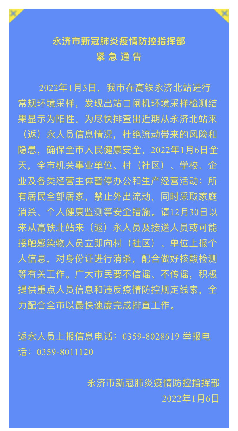 2022年1月5日,山西省永濟(jì)市在高鐵永濟(jì)北站進(jìn)行常規(guī)環(huán)境采樣,發(fā)現(xiàn)出站口閘機(jī)環(huán)境采樣檢測(cè)結(jié)果顯示為陽(yáng)性。為盡快排查出近期從永濟(jì)北站來(lái)(返)永人員信息情況,杜絕流動(dòng)帶來(lái)的風(fēng)險(xiǎn)和隱患,確保全市人民健康安全,1月6日全天,全市機(jī)關(guān)事業(yè)單位、村(社區(qū))、學(xué)校、企業(yè)及各類經(jīng)營(yíng)主體暫停辦公和生產(chǎn)經(jīng)營(yíng)活動(dòng);所有居民全部居家,禁止外出流動(dòng),同時(shí)采取家庭消殺、個(gè)人健康監(jiān)測(cè)等安全措施。請(qǐng)12月30日以來(lái)從高鐵北站來(lái)(返)永人員及接送人員或可能接觸感染物人員立即向村(社區(qū))、單位上報(bào)個(gè)人信息,對(duì)身份證進(jìn)行消殺,配合做好核酸檢測(cè)等有關(guān)工作。廣大市民要不信謠、不傳謠,積極提供重點(diǎn)人員信息和違反疫情防控規(guī)定線索,全力配合全市以最快速度完成排查工作。