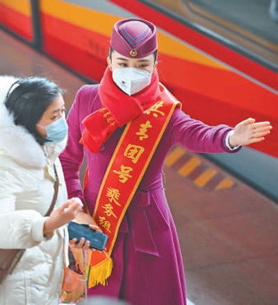 春運(yùn)首日,成渝高鐵“復(fù)興號”智能動(dòng)車組“共青團(tuán)號”列車首發(fā),這是全國首次在“復(fù)興號”智能動(dòng)車組中常態(tài)化開行“共青團(tuán)號”列車,列車將開展常態(tài)化志愿服務(wù)。圖為志愿者服務(wù)旅客乘車。