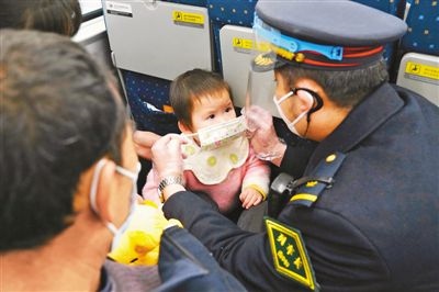 南昌客運(yùn)段“井岡山號”列車乘務(wù)人員積極開展“暖心春運(yùn)”行動(dòng),通過貼喜慶窗花、贈(zèng)小旅客愛心手環(huán)和卡通口罩等一系列溫馨舉措,把溫暖送到旅客身邊。圖為乘務(wù)人員為小旅客贈(zèng)送愛心口罩。