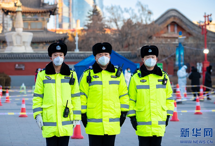 2月21日,在呼和浩特市玉泉區(qū)小召街道五塔寺廣場臨時核酸采樣點(diǎn),玉泉交管大隊(duì)民警在執(zhí)勤。新華網(wǎng)發(fā) (丁根厚 攝)