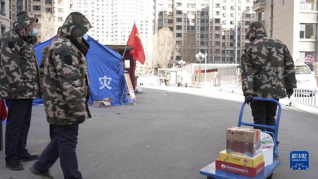 2月20日,呼和浩特市疫情防控工作人員為封控小區(qū)居民運(yùn)送物資。新華社記者 達(dá)日罕 攝