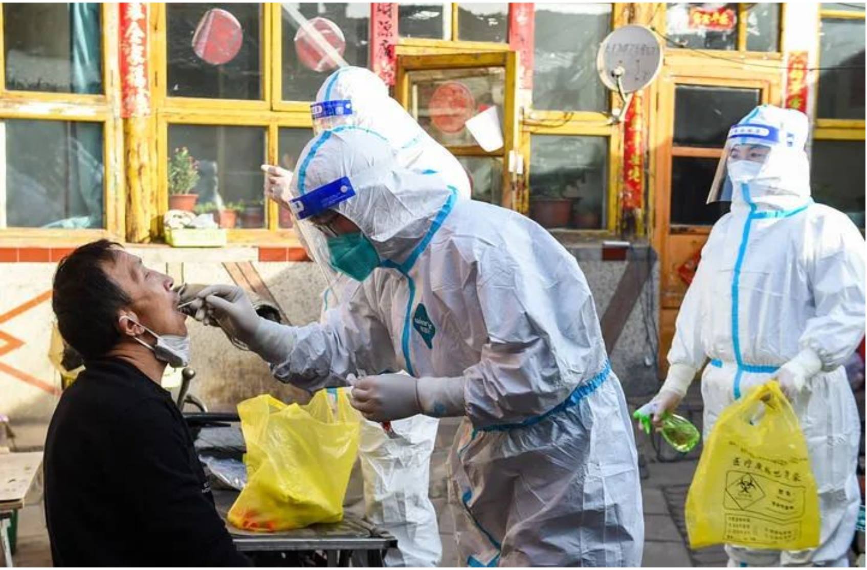 ↑3月6日,在呼和浩特市賽罕區(qū)東瓦窯社區(qū),網(wǎng)格員(右一)輔助醫(yī)務(wù)工作者為次密接群眾上門做核酸檢測。