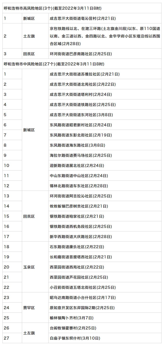 按照國務(wù)院聯(lián)防聯(lián)控機(jī)制《關(guān)于調(diào)整新冠肺炎疫情分區(qū)分級標(biāo)準(zhǔn)實(shí)施精準(zhǔn)管控措施的通知》規(guī)定,經(jīng)專家組評估,市指揮部研究決定,決定于3月11日8時(shí)起,將新城區(qū)保和少鎮(zhèn)野馬圖村,回民區(qū)環(huán)河街街道太平街社區(qū),玉泉區(qū)長和廊街道大召社區(qū)、小召前街街道建華北街社區(qū)調(diào)整為低風(fēng)險(xiǎn)地區(qū)。其他地區(qū)風(fēng)險(xiǎn)等級不變。