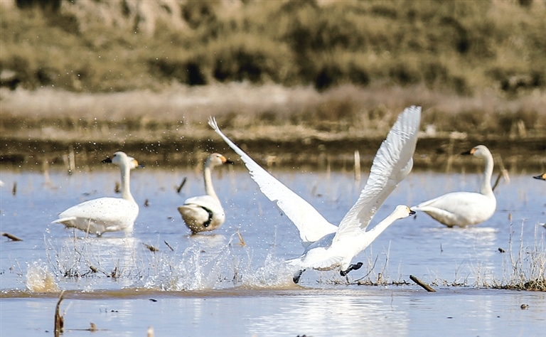 托克托縣黃河濕地管護(hù)中心副主任王曉東接受記者采訪時表示,黃河流經(jīng)托克托縣37.5公里、9個自然村。隨著近年來對黃河流域生態(tài)環(huán)境保護(hù)力度的加大,每年都會吸引大批鳥類來托克托縣“做客”,其中尤以天鵝最受關(guān)注。天鵝屬于國家二級保護(hù)鳥類,每年從2月底3月初開始,就會成群結(jié)隊來黃河流域一帶停歇、棲息、覓食,補(bǔ)充能量后,再繼續(xù)飛行,最多的時候有上萬只。(記者 張巧珍 牛天甲)