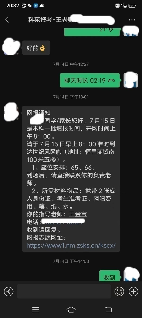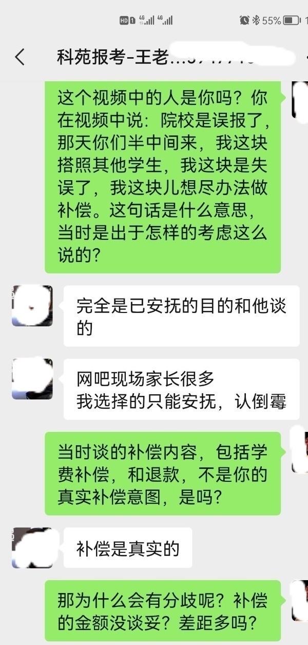 據(jù)樊女士介紹,負責給小安報志愿的是科苑報考的王金寶老師,也是內(nèi)蒙古科苑信息科技有限公司的股東之一。樊女士提供的視頻顯示,這名老師在網(wǎng)報志愿現(xiàn)場回復樊女士:“院校就是誤報了,因為那天你們是半中間來,還有其他學生,搭照學生,我這塊兒就失誤了,我這塊兒想盡辦法做補償?!比欢?,樊女士反映,那天以后,這名老師開始反口,不承認誤報,也不愿意按照當天商定的補償方案執(zhí)行。