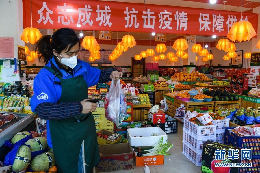 11月17日,在呼和浩特市新城區(qū)一家水果店,工作人員給商品包裝消毒。新華社記者 王澤聰 攝