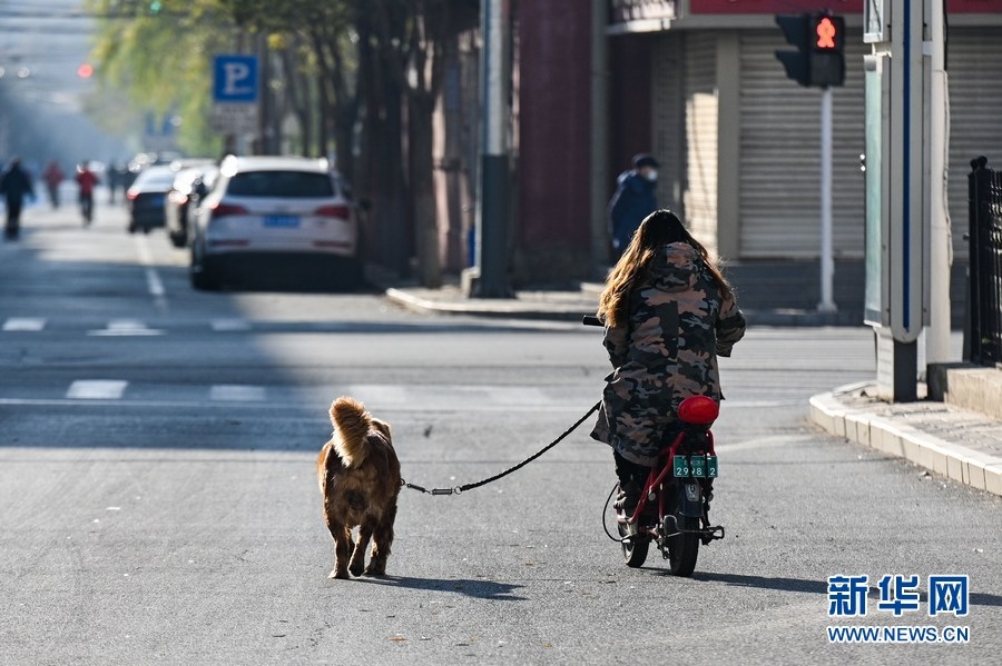 11月17日,在呼和浩特市新城區(qū),市民出行遛狗。新華社記者 王澤聰 攝