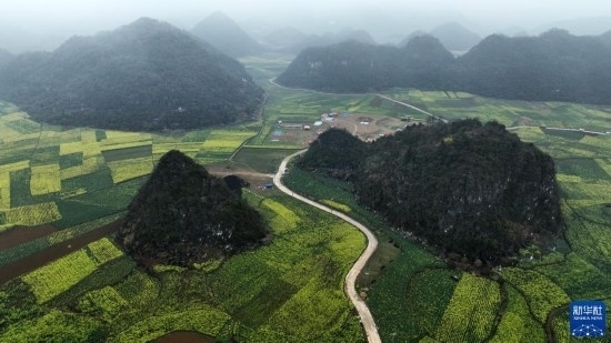 2月17日拍攝的貴州省六盤(pán)水市六枝特區(qū)木崗鎮(zhèn)萬(wàn)畝油菜基地(無(wú)人機(jī)照片)。