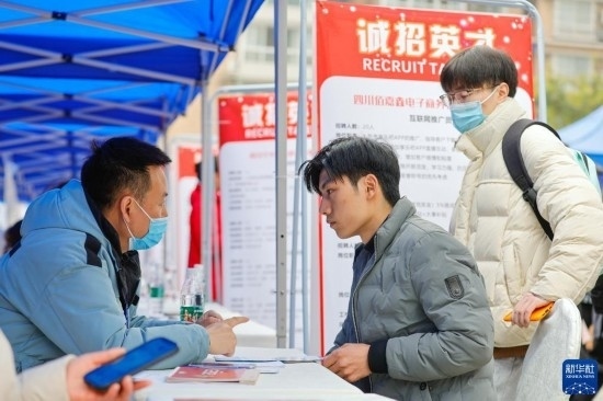 2月17日,在中國成都人力資源服務產(chǎn)業(yè)園,求職者(中)與招聘企業(yè)工作人員交流。